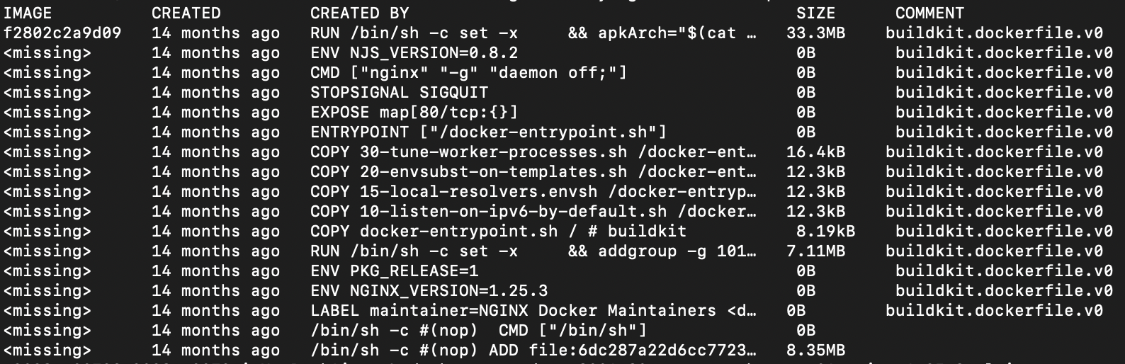▫️ 이미지가 어떻게 만들어 졌는지 history 확인 → docker image history nginx:1.25.3-alpine