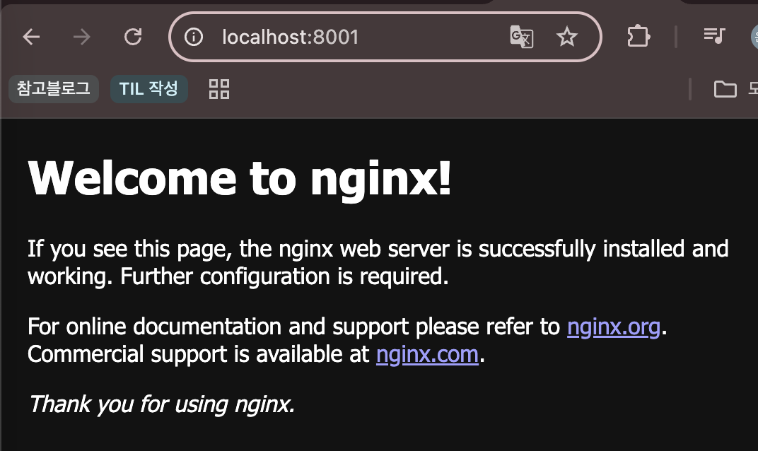 ▫️ Nginx 서버를 실행하여 동작을 테스트 → docker run -d -p 8080:80 nginx
