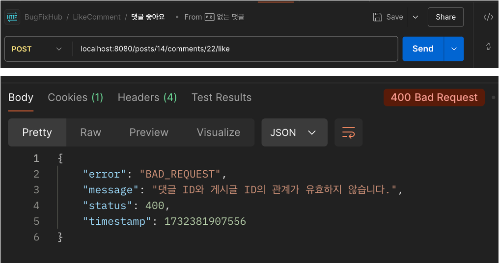 โ Comment Like(๋๊ธ ์ข์์) ์ฝ๋ ๊ตฌํ ํ Postman์ผ๋ก API ํธ์ถ ๊ฒฐ๊ณผ๋ฅผ ํ์ธํ๋ ์ค,