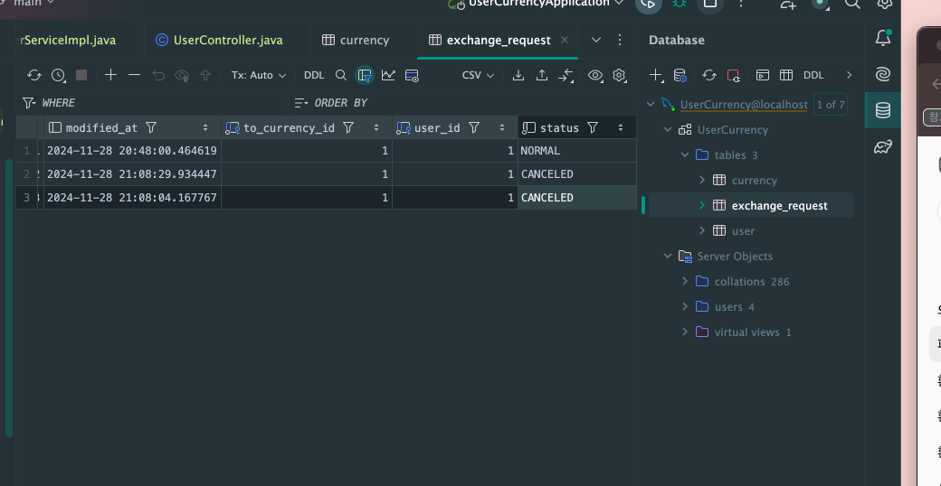 → IntelliJ ๋ฐ์ดํฐ๋ฒ ์ด์ค: exchange_request ํ ์ด๋ธ์ ์ํ๊ฐ NORMAL์์ CANCELED๋ก ์ ์์ ์ผ๋ก ๋ฐ์๋๋ ๊ฒ์ ํ์ธ
