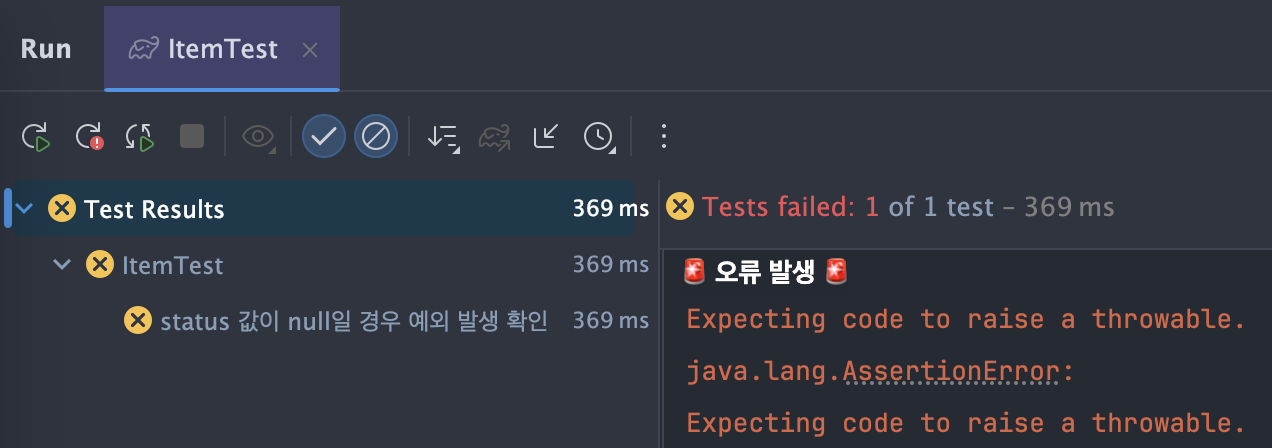 ๐ ItemTest ํด๋์ค์์ ์์ธ ๋ฐ์ ํ ์คํธ ์คํจ