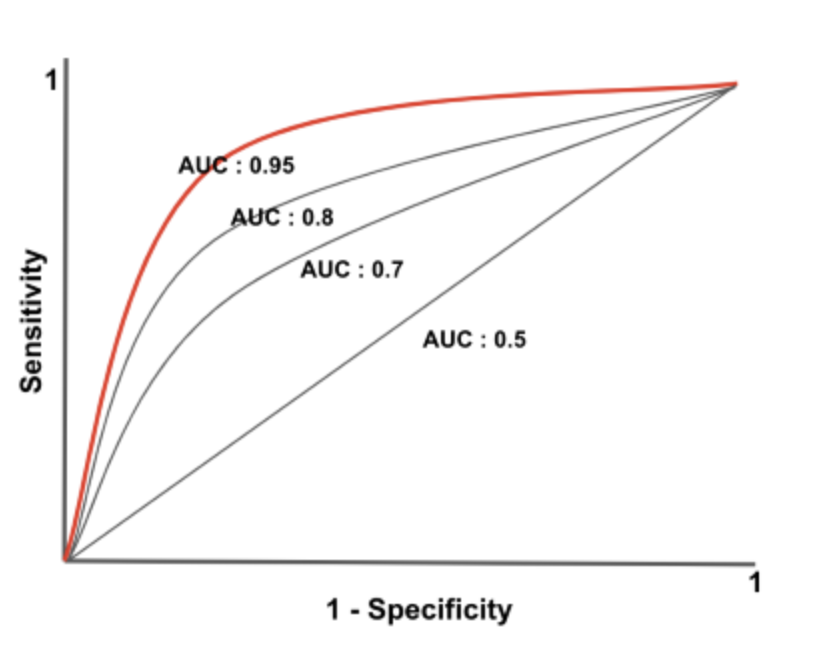- AUROC์ ๊ฐ์ด 1์ ๊ฐ๊น์ธ์๋ก ์ฑ๋ฅ ์ฐ์, 0.5์ ๊ฐ๊น์ธ์๋ก ์ข์ง ์์!
